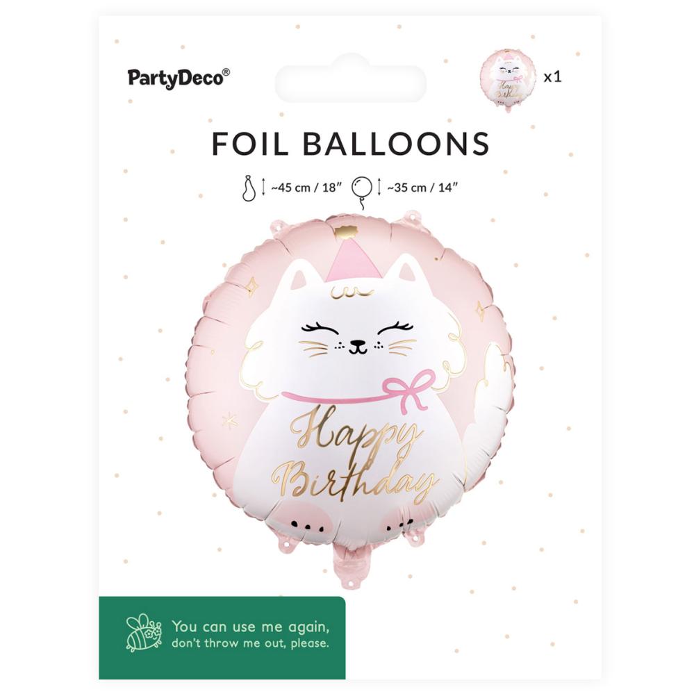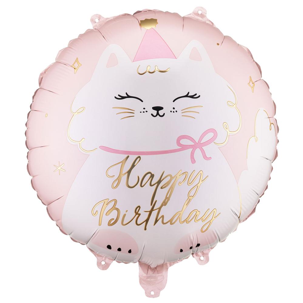 Denne fødselsdagsballon er en katteballon, som liver enhver fødselsdag op, og til en fest med dyr som tema bliver denne runde ballon med teksten Happy Birthday en legesyg folieballon.