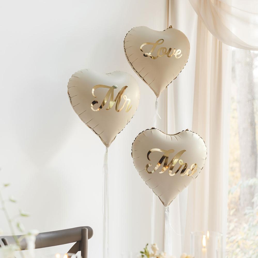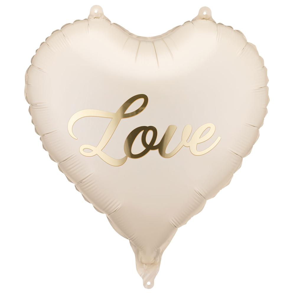 Folieballon Hjerte Love 35 cm omfatter en beige hjerteformet ballon med teksten 'Love' i guld. Kan fyldes med luft eller helium og leveres med et sugerør til oppustning.