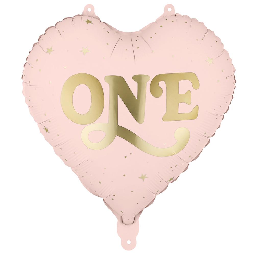 Folieballon Hjerte One Lyserosa omfatter en lyserød, hjerteformet ballon med ordet 'ONE' i elegant guldfarve i midten, omgivet af små prikker og stjerner langs ballonens kant i en skinnende guldfinish. Den kan fyldes med luft eller helium og leveres med et sugerør til oppustning.