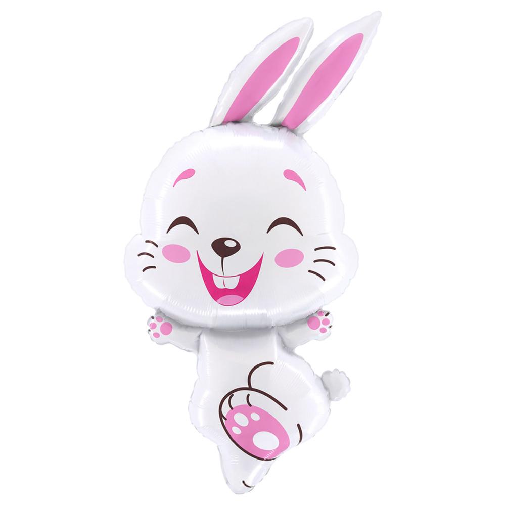 Folieballon Hvid Kanin omfatter en hvid folieballon med lyserøde og sorte detaljer i form af en lykkelig kanin med lukkede øjne og et bredt smil.