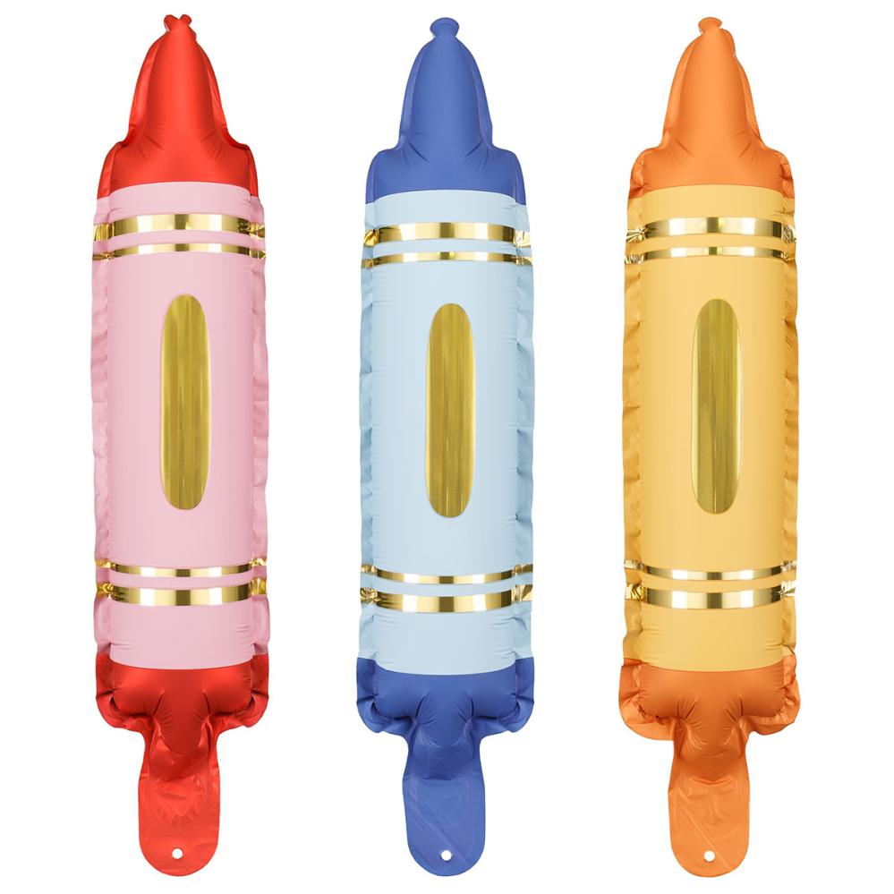 Gør børnefødselsdagen ekstra farverig med disse folieballoner i form af kridt. Sættet indeholder tre balloner i blå, orange og rød med gyldne detaljer.