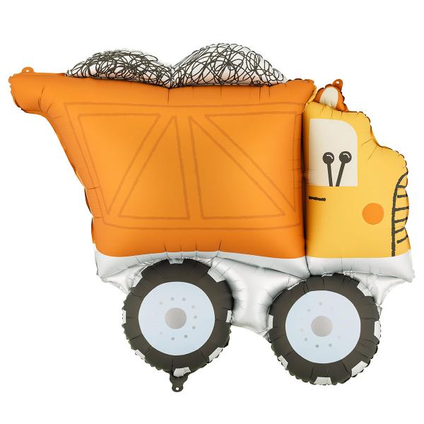 Folieballon Lastbil 87 x 69 cm er en ballon i form af en gul lastbil med orange last og sorte dæk. Ballonen fyldes med luft via det medfølgende pusterør eller med helium.