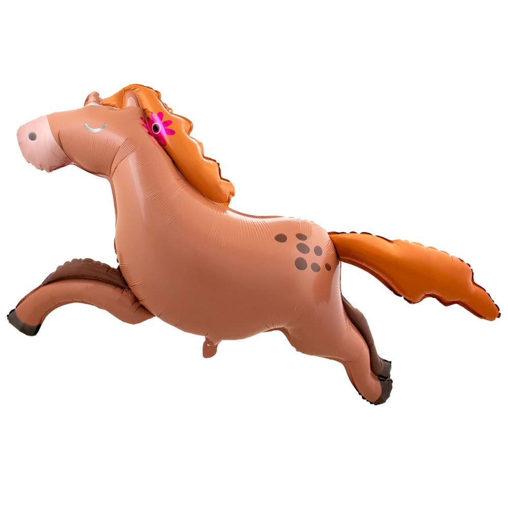 Folieballon Løbende Hest 123 x 80 cm omfatter en folieballon i form af en løbende hest i forskellige nuancer af brun samt en smuk dekorationsblomst rundt om manen.