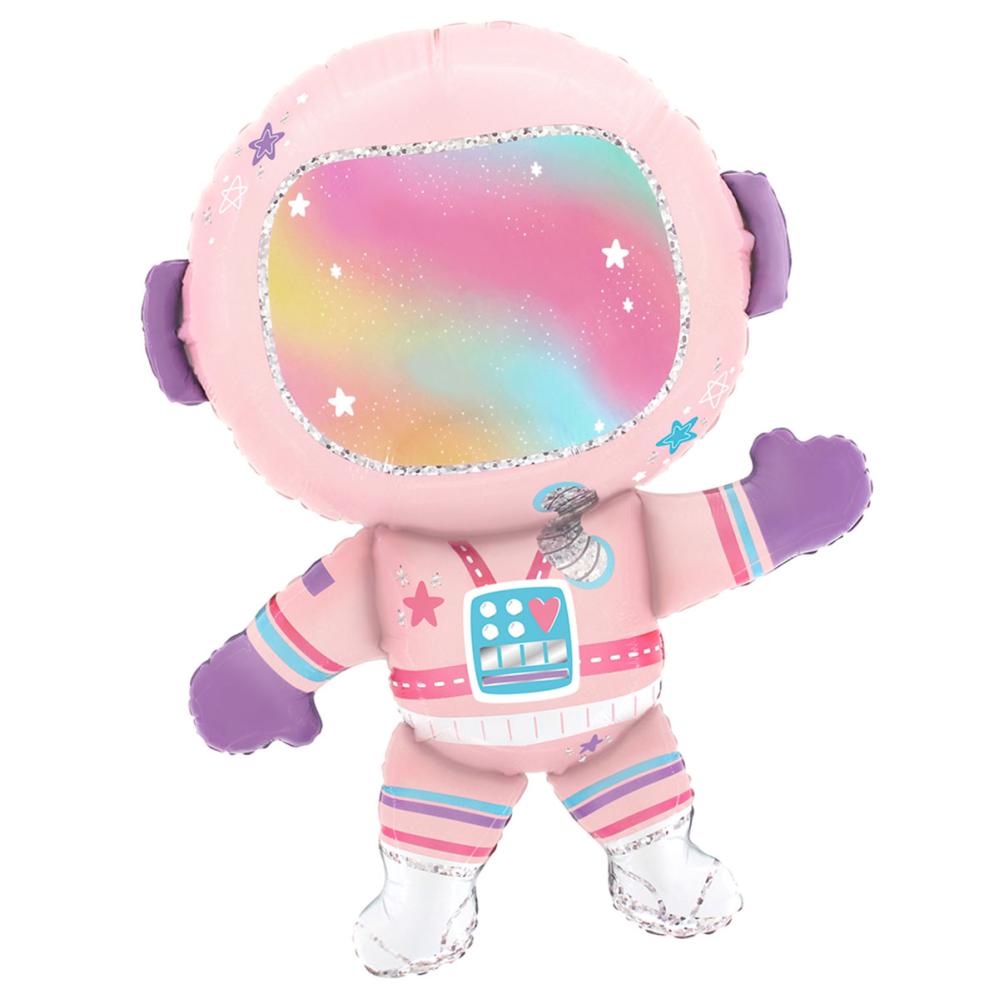 Gør din rumfest endnu festligere med en folieballon i form af en lyserød astronaut. Den lyserøde dragt med lilla detaljer og det regnbuefarvede visir fanger blikkene. En perfekt astronautballon til ethvert ballonelskende barn.
