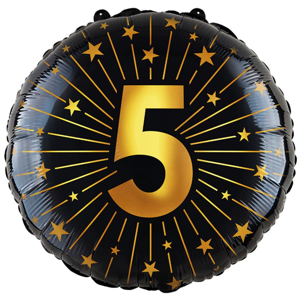 Folieballon med Stjerner og Tallet 5 er en rund folieballon med strålende stjerner og tallet "5" i guld mod sort baggrund.