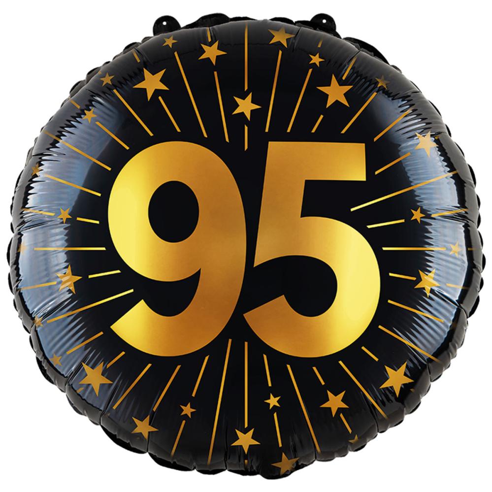 Folieballon med Stjerner og Tallet 95 er en rund folieballon med strålende stjerner og tallet "95" i guld mod sort baggrund.