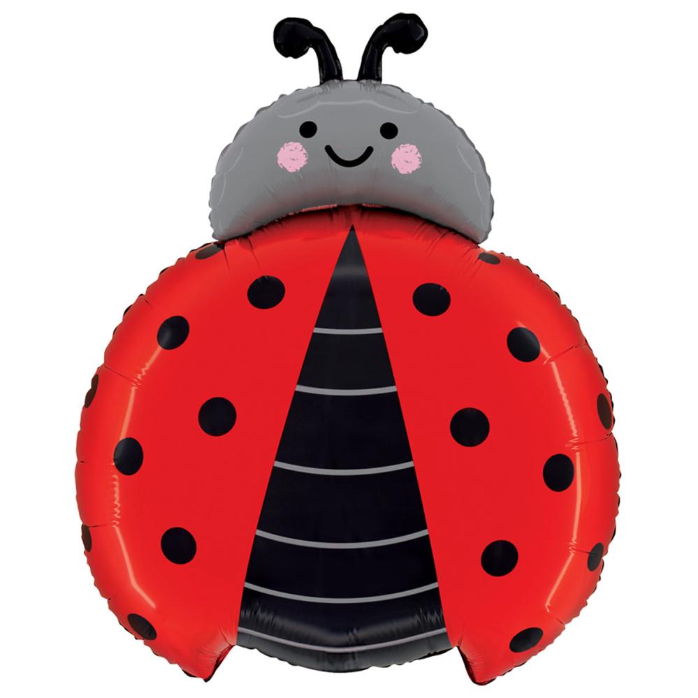 Folieballon Sød Mariehøne omfatter en folieballon i form af en mariehøne med et sødt ansigt og røde vinger med sorte prikker på.