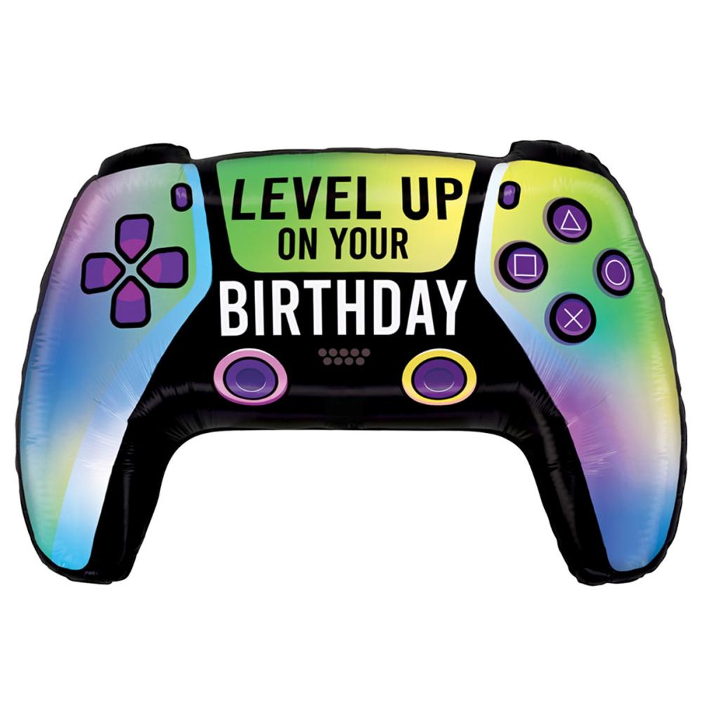 Fejr med en farverig happy birthday ballon formet som en spillekontrol. Denne folieballon har en regnbueeffekt og teksten Level Up On Your Birthday i sort og hvid. Perfekt fødselsdagsballon til en børnefødselsdag og et must blandt balloner til en gaming fest.
