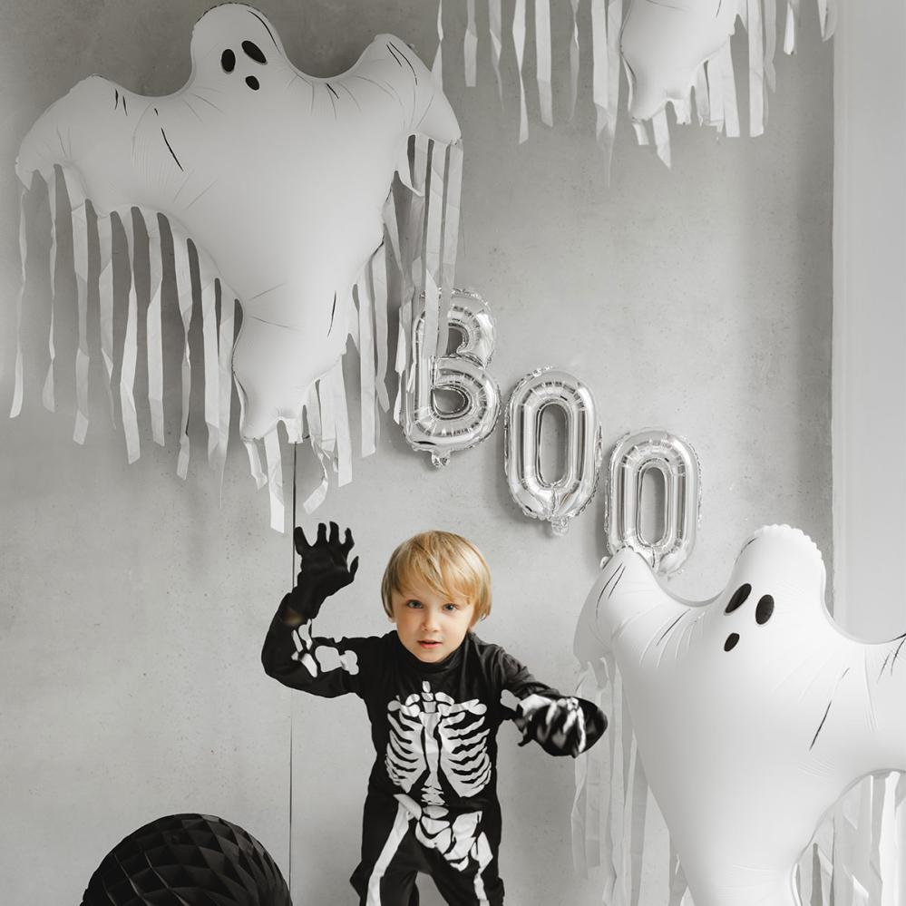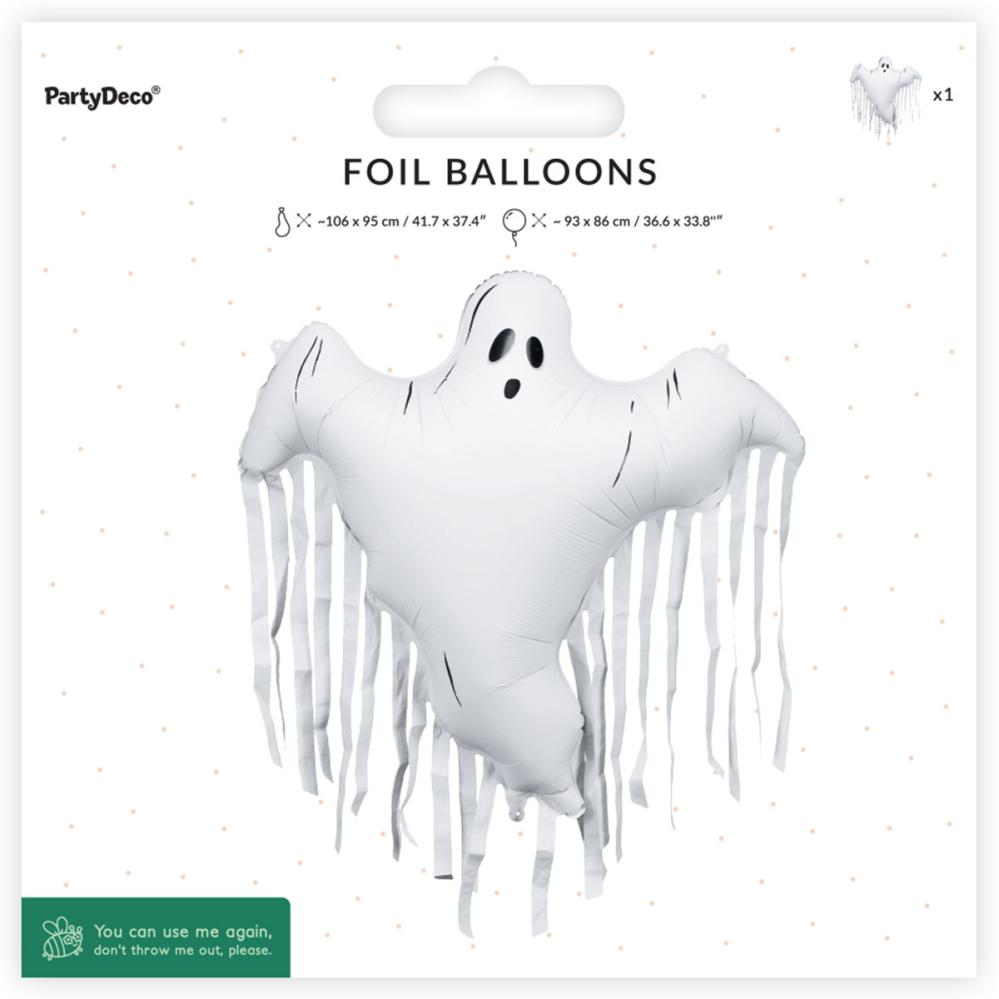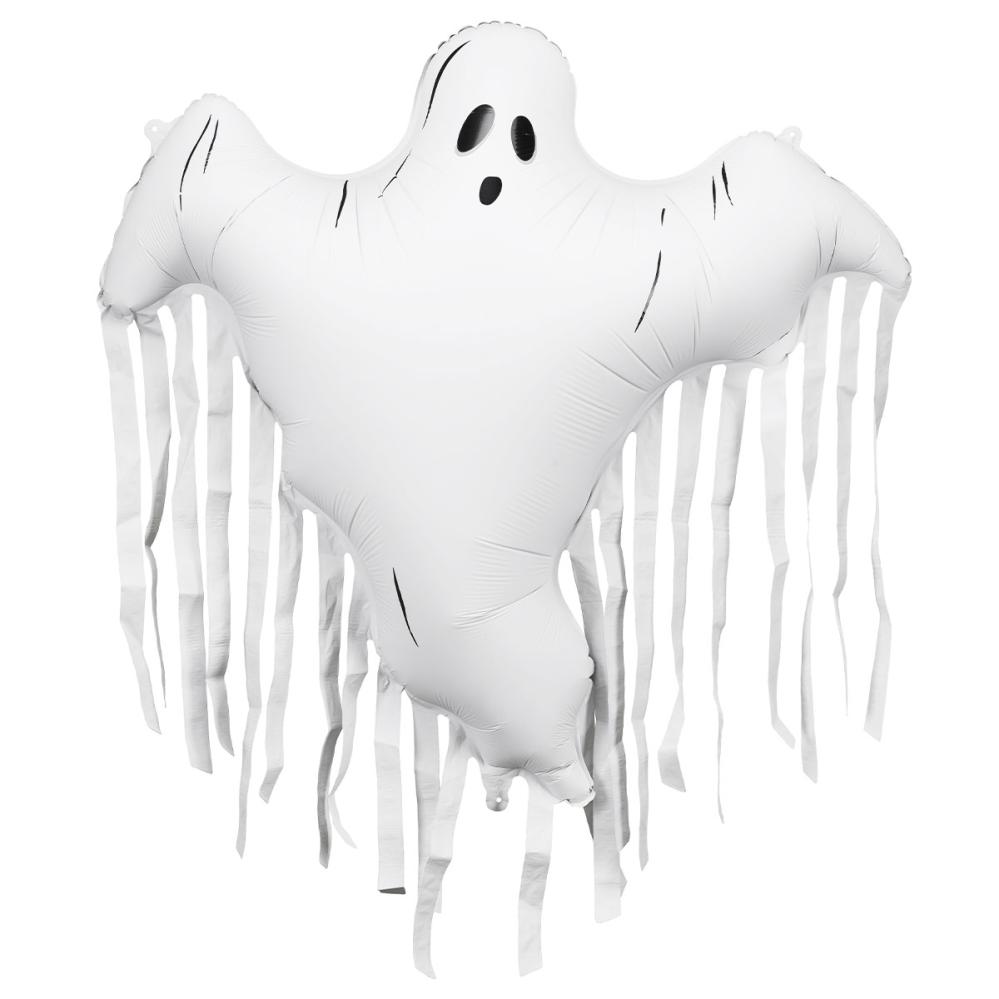 Folieballon Spøgelse omfatter en folieballon i form af et hvidt spøgelse med hvide strimler og sorte detaljer. Ballonen kan fyldes med luft med det medfølgende pusterør eller med helium.