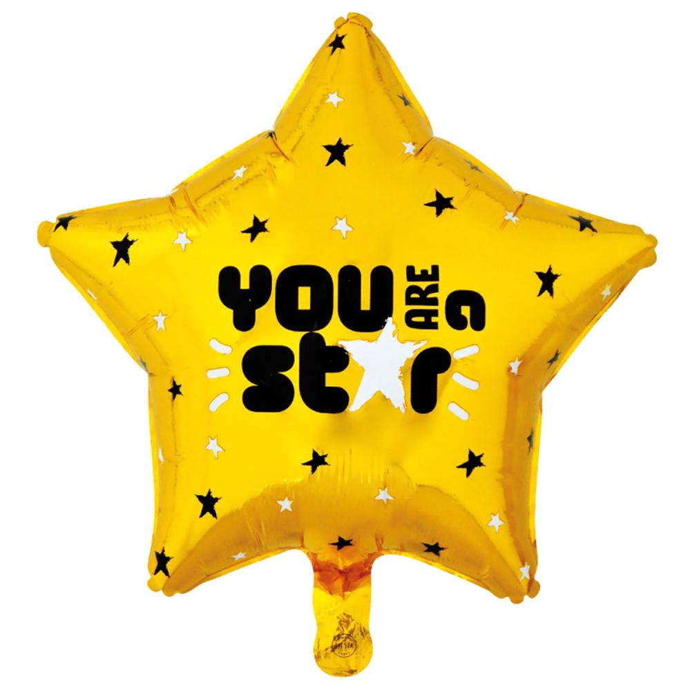 Folieballon Stjerne You Are A Star 46 cm omfatter en guldfarvet folieballon, der er formet som en stjerne og har motiv af små hvide og sorte stjerner samt teksten "YOU ARE a star" i sort, hvor bogstavet a i ordet star er erstattet af en hvid stjerne.
