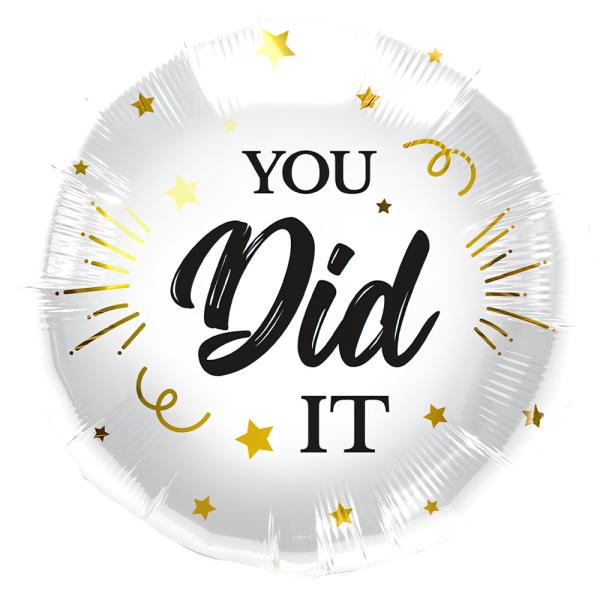 Folieballon You Did It inkluderer en blank hvid og rund folieballon med teksten "You did it" i sort med gyldne stjerner og detaljer rundt omkring. Ballonen er cirka 45 cm stor og kan fyldes med luft eller helium og rummer cirka 18 liter.