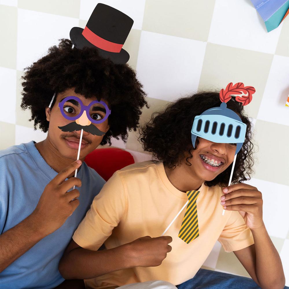 Kalas fotoprops på pind i fantasifulde motiver som ridderhjelm, kongekrone og pirathat gør hvert billede uforglemmeligt. Perfekt som festfotorekvisitter eller fotobåsrekvisitter som børn vil elske at lege med.