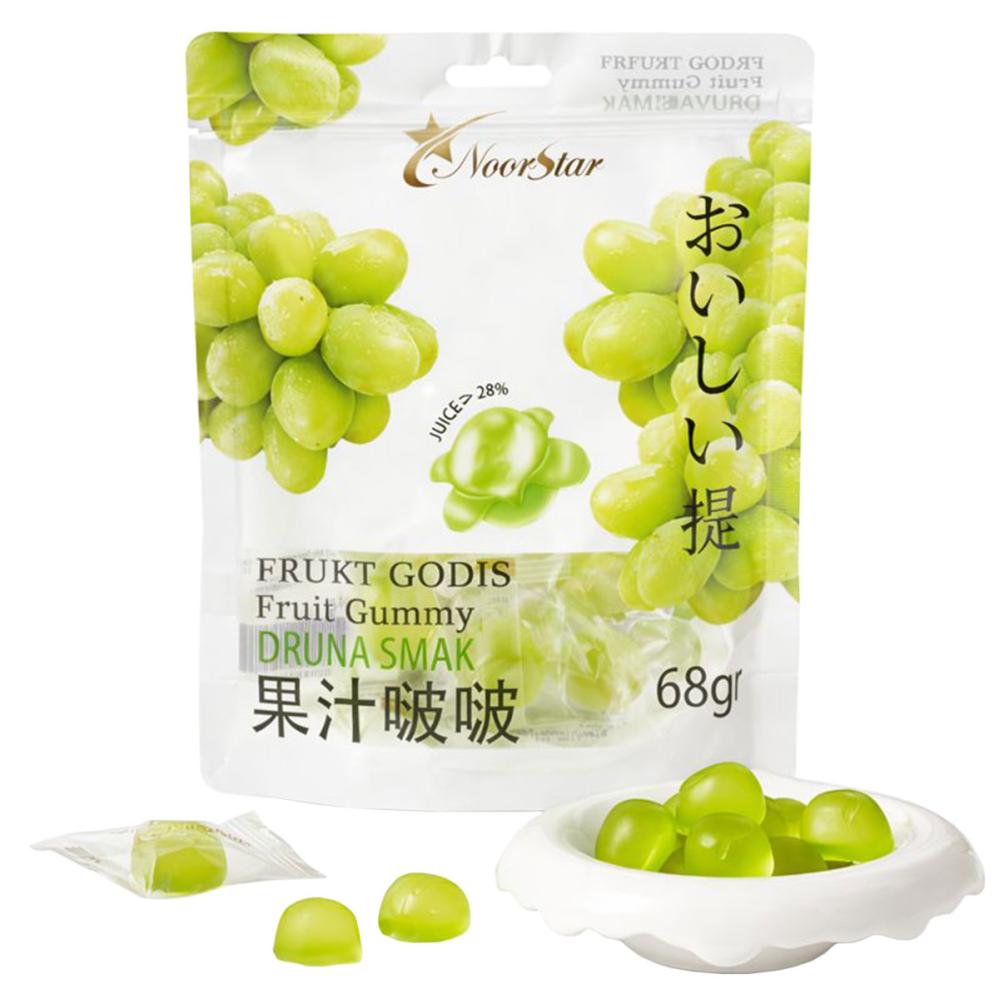 Frugtslik Grønne Druer 68g omfatter en pose med 68 gram indpakkede frugtslikstykker med smag af grønne druer.