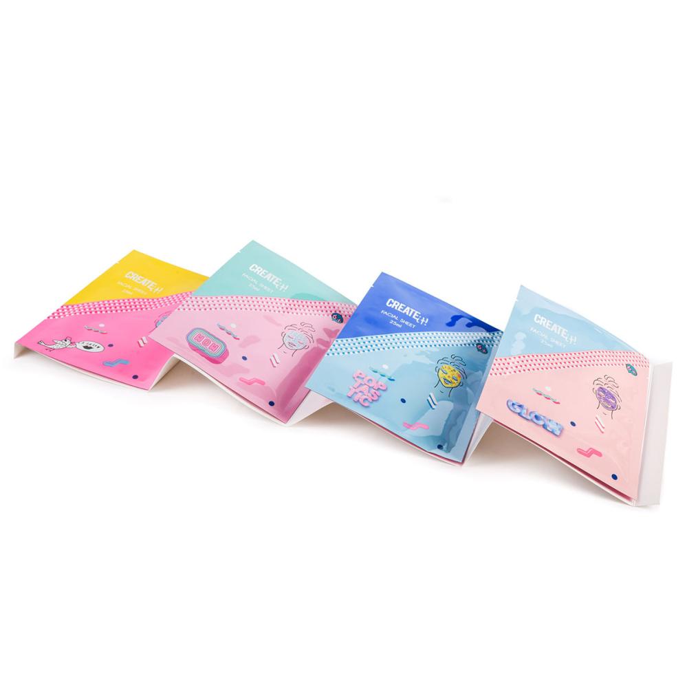 Fugtgivende Ansigtsmaske med Motiv omfatter en fugtgivende ansigtsmaske med et farverigt motiv. Ansigtsmasken findes i fire forskellige varianter men de sælges usorterede og stykvis så det bliver en overraskelse hvilken du får. Billeder med instruktioner til brug findes på emballagen.
