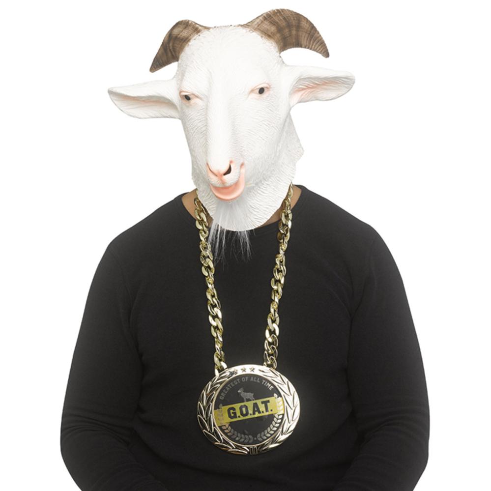 G.O.A.T Tilbehørssæt omfatter et sæt indeholdende en realistisk og detaljeret gedemaske i latex, komplet med både skæg og horn, samt en stor, skinnende medaljon fastgjort til en kraftig guldfarvet kæde. Medaljonen er prydet med teksterne 'GREATEST OF ALL TIME' og 'G.O.A.T.'.