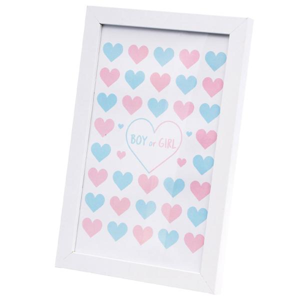 Gæstebog Ramme Gender Reveal omfatter en hvid gæstebog ramme med glasfront og hvid baggrund med teksten "Boy or Girl" samt blå og lyserøde hjerter.