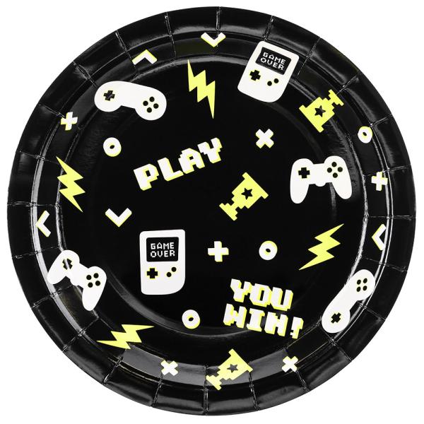Gaming Paptallerkener Sort 23 cm består af seks paptallerkener med gaming motiv. Hver tallerken er dekoreret med spillekontroller, retro håndholdt konsol med teksten "GAME OVER", spredte knapper, lyn, pokaler samt teksterne "PLAY" og "YOU WIN!" i farverne limegrøn og hvid mod en sort baggrund.