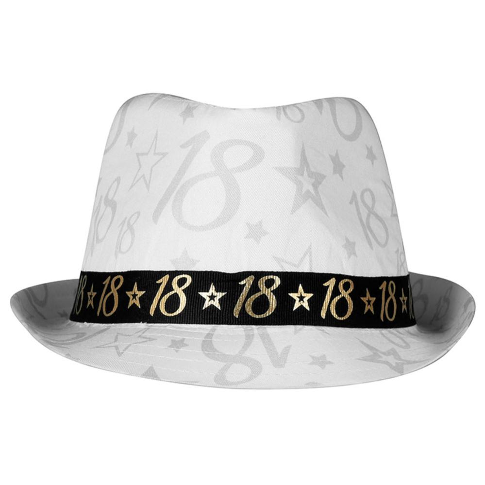 Gangsterhat 18 år omfatter en hvid gangsterhat med motiv af tallet 18 og stjerner, trykt i gråt direkte på hatten og i guld på det sorte bånd rundt om.