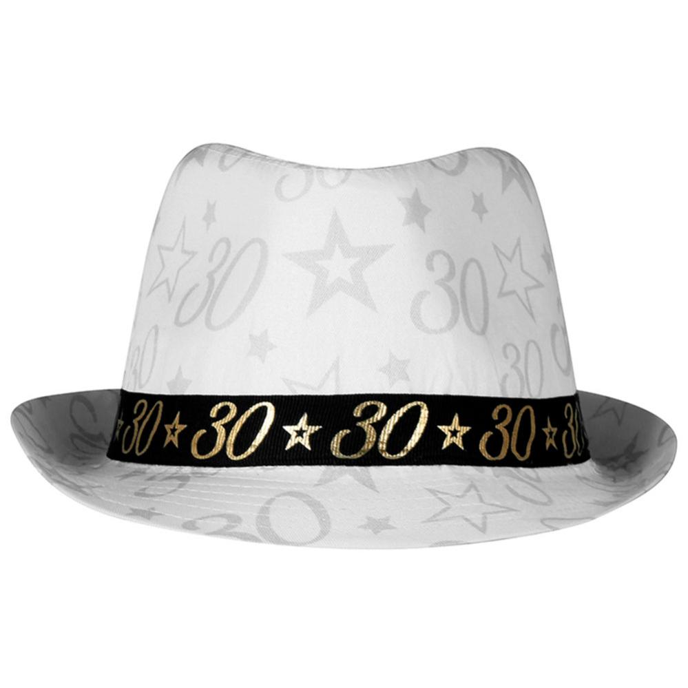 Gangsterhat 30 år omfatter en hvid gangsterhat med motiv af tallet 30 og stjerner, trykt i gråt direkte på hatten og i guld på det sorte bånd rundt om.