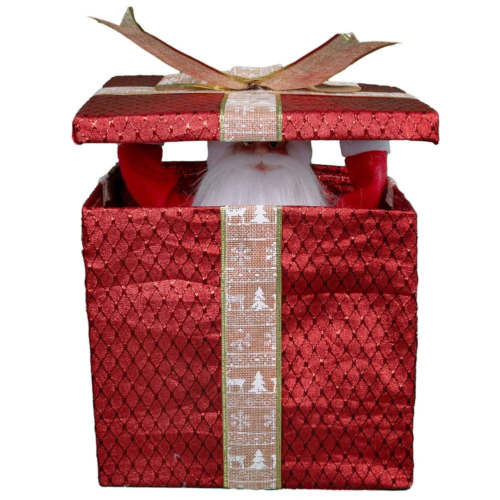 Gaveæske med Animeret Julemand omfatter en juledekoration i form af en rød gaveæske med en julemand indeni som åbner og lukker låget samtidig med at melodien "We Wish You a Merry Christmas" afspilles.