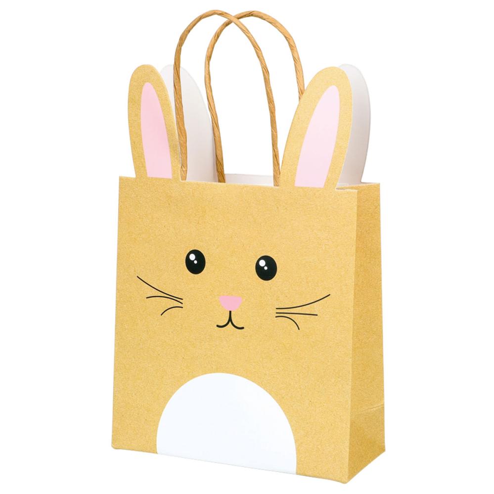 Gavepose Kanin Kraftpapir 12x6x15 cm er en gavepose i en beige nuance med motiv af en kanin med hvide og rosa detaljer. Posen har opstående kaninører og hvide bærehåndtag.