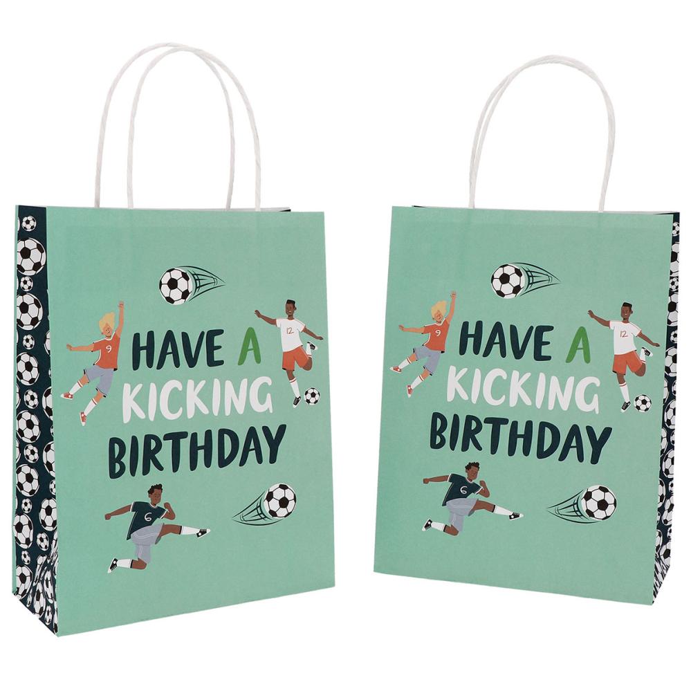 Gaveposer Fodbold Fødselsdagsfest 6-pak består af seks turkise gaveposer med hank, hvor begge sider prydes af motiv med fodboldspillere og teksten "Have A Kicking Birthday". Kortsiderne og undersiden er i en mørkeblå nuance, og på siderne findes der også motiver af fodbolde.