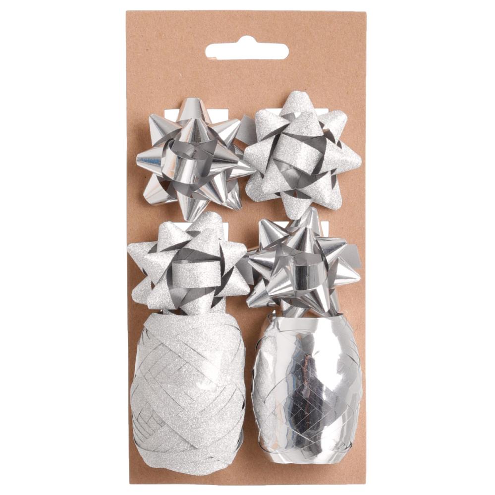 Gavesnor og Sløjfe Kit Sølv omfatter et sølvfarvet gaveindpakningssæt med et skinnende gavesnor, et gavesnor med glimmer, to skinnende gavesløjfer og to gavesløjfer med glimmer.