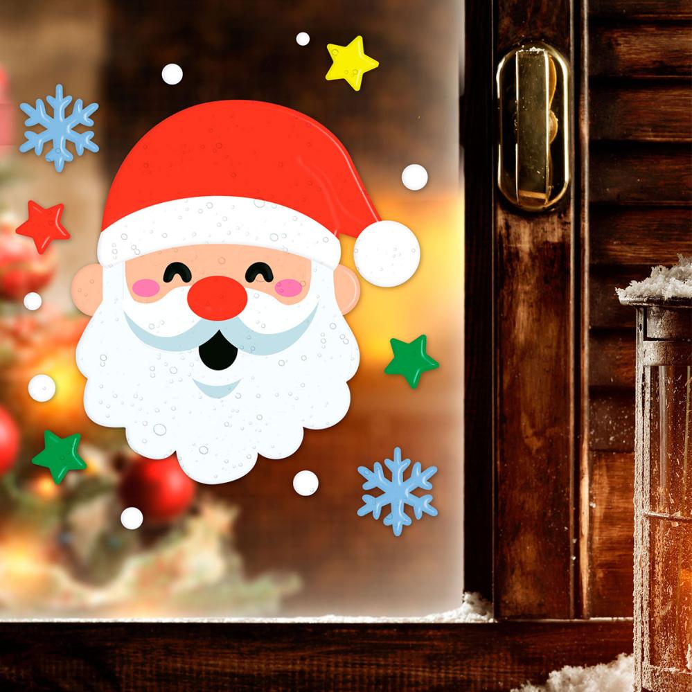Gel Vinduesdekoration Julemand omfatter et ark som indeholder gelélignende vinduesdekorationer forestillende en julemand, stjerner og snefnug. Dekorationerne kan nemt sættes på spejle og glas og fjernes uden at efterlade mærker. Bemærk at det ikke er ét stort stykke, men flere enkelte dele som sættes på vinduet.