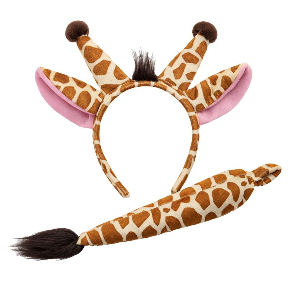 Girafører og Hale Tilbehørssæt omfatter et par girafører fastgjort på et diadem klædt med stof. Der medfølger også en matchende stofhale med falsk pels yderst.