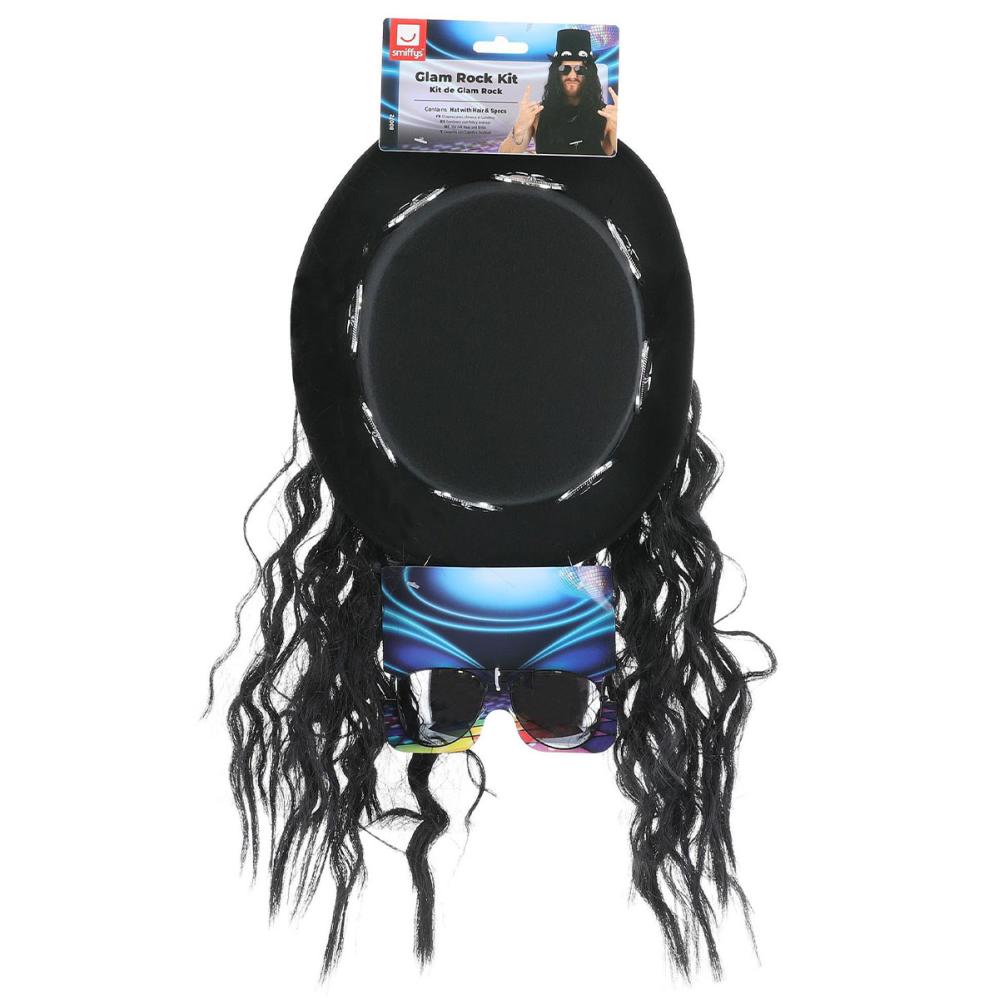 Glamrock Hat med Hår & Briller omfatter en sort høj hat med sølvfarvede dekorationer omkring båndet samt fastsiddende langt, bølget hår. Der medfølger også et par sorte retrobriller med spejllinser. Bemærk at brillerne ikke er UV-beskyttede!