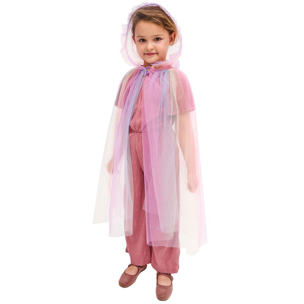 Glitrende Regnbuekappe med Hætte Børn omfatter en glitrende kappe med hætte, der er lavet af et tylmateriale. Kappen skinner i sine lyse regnbuefarver og lukkes nemt omkring halsen med en knap.