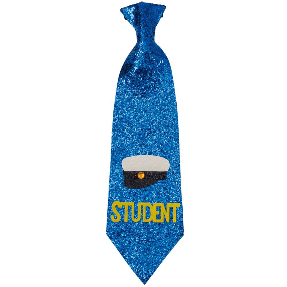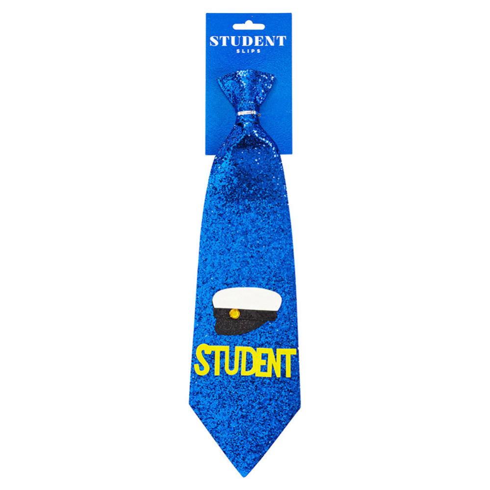 Glitrende Studenterslips indeholder en blå glinsende slips med en gul "Student" tekst og en glinsende hvid-sort studenterhue med en lille diamant på. Slipsen har et sort elastisk bånd øverst, som nemt trækkes over hovedet.