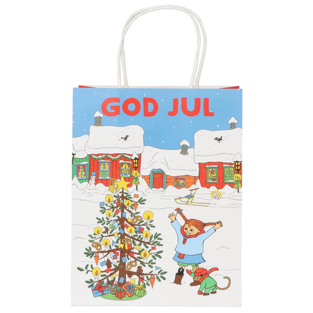 Fejr højtiden med en charmerende julepose, der spreder glæde. Denne gavepose med julemotiv fra Pippi Langstrømpe er prydet med herlige farver og passer perfekt som julegavepose til både store og små.