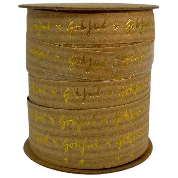 God Jul Gavesnor 10 m er et beige gavesnor med teksten "God Jul" i skinnende guldfarve.
