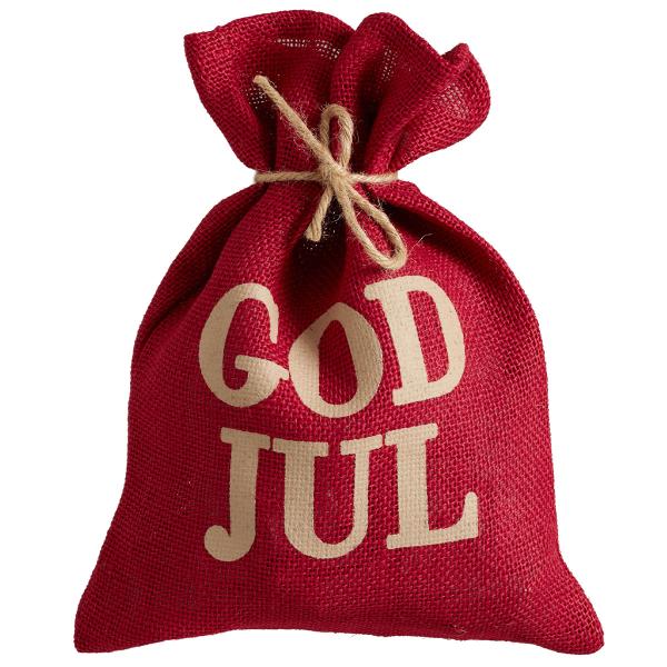 God Jul Julegavesæk 38 cm omfatter en rød julegavesæk i jutevæv med teksten "God Jul" i beige. Sækken har en beige rebsnor til at snøre åbningen sammen.