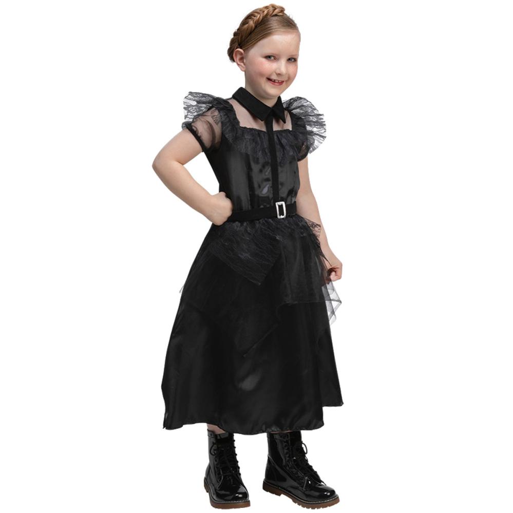 Træd ind i mørkets elegance med denne sorte kjole til Halloween. Perfekt som Halloween baldronning kostume eller som heksedragt til børn, der vil skille sig ud med stil.