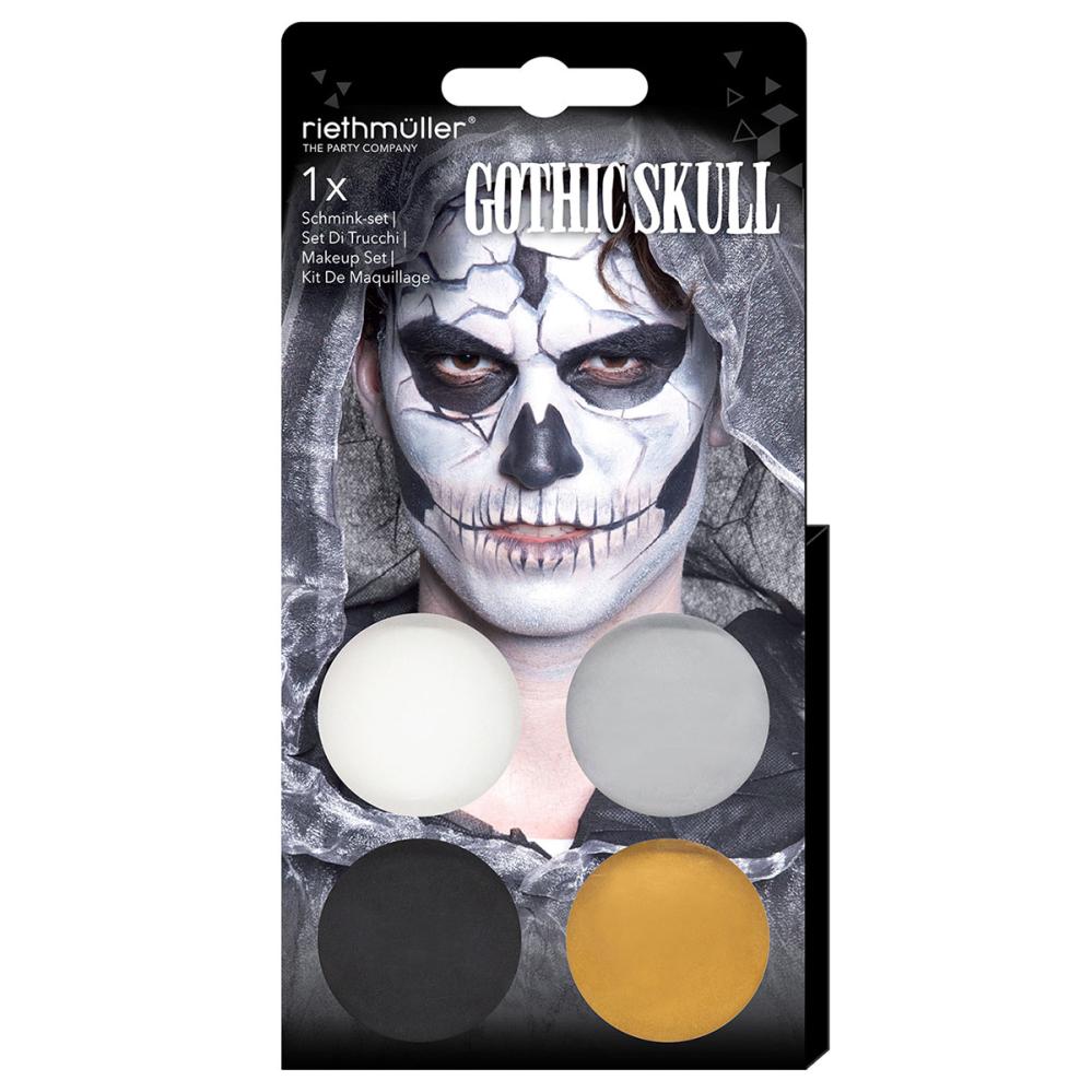 Gotisk Dødningehoved Sminkesæt er et sæt med alt, hvad der behøves for at lave en komplet gotisk dødningehoved-sminkning. Sættet indeholder fire vandbaserede farver (sort, hvid, sølv og guld) samt en lille sminkepensel. Farven vaskes nemt af med sæbe og vand.