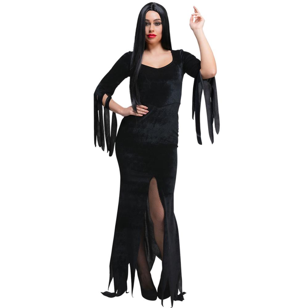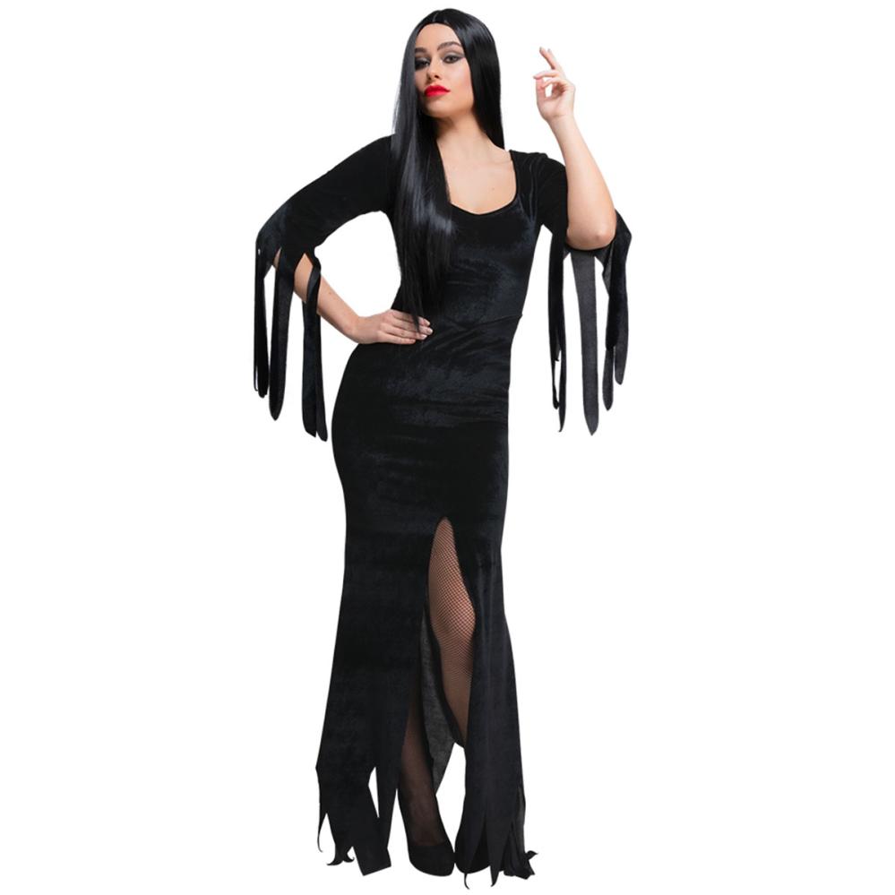 Væk mørkets dronning i dig med en sort Halloween kjole. Den gotiske heksekostume med tentakellignende ærmer og en dramatisk slids foran er perfekt som Morticia Addams kostume til Halloween eller andre uhyggelige maskerader.