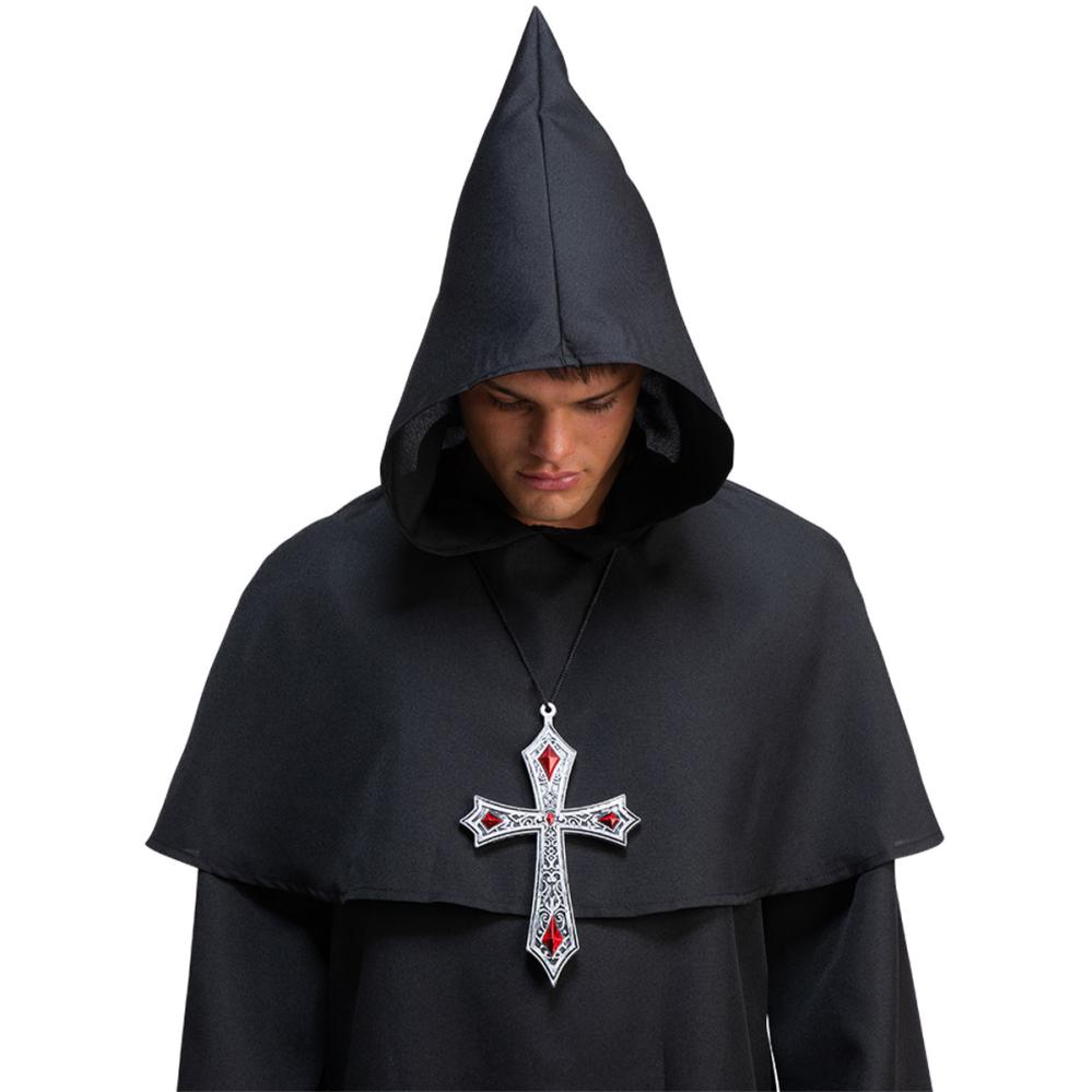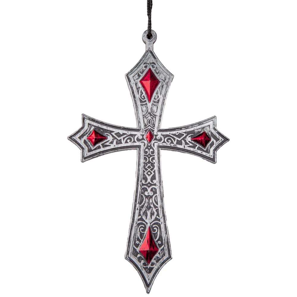 Et gotisk Halloween kors som fuldender din vampyrlook. Med realistisk sølvlook, røde juveler og sort snor bliver dette vampyrkors et perfekt Halloween kostumetilbehør til en elegant udklædning.
