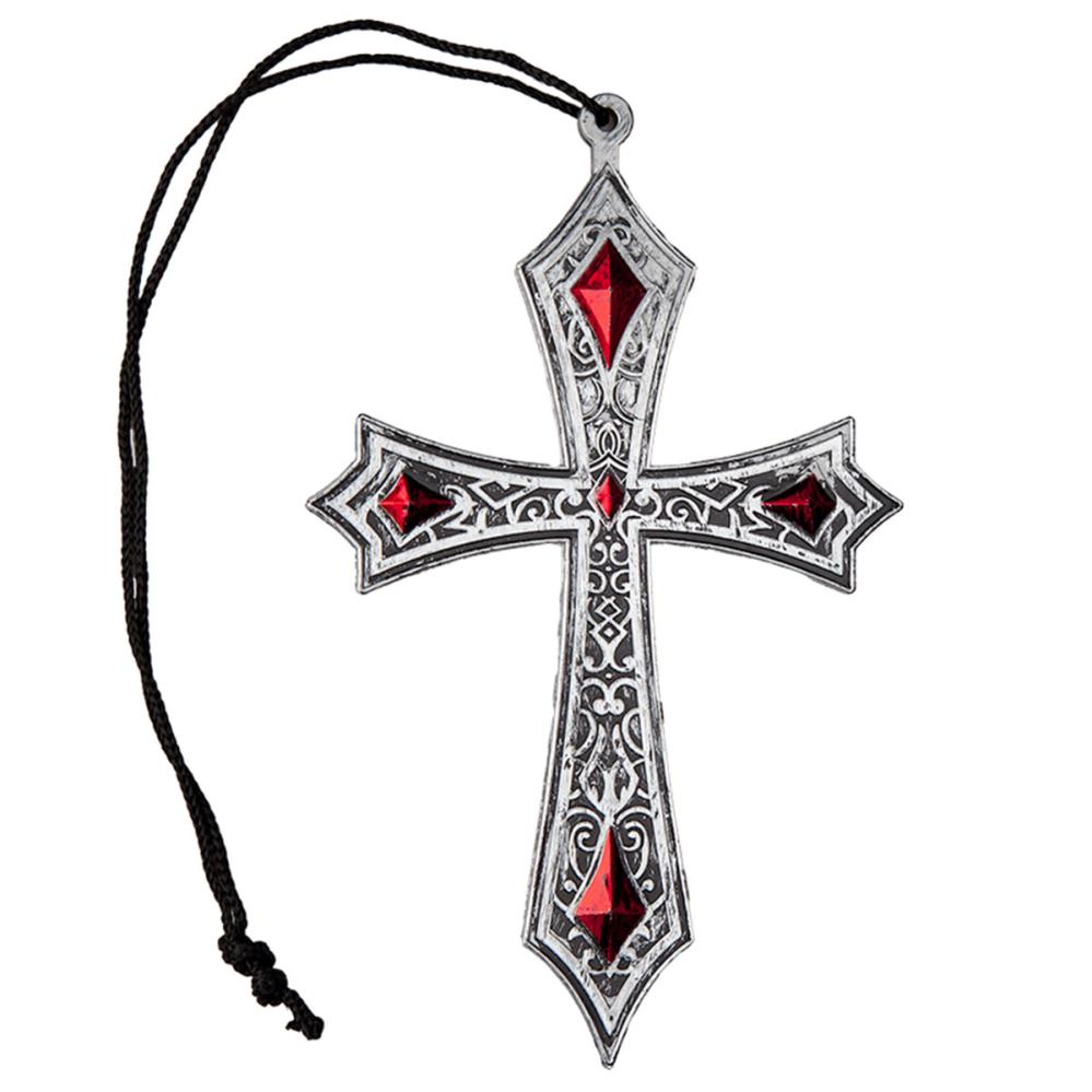 Gotisk Sølvkors består af et kors lavet i plast som er farvet til at ligne et ægte sølvkors med røde juveler. Øverst på korset er der også en løkke med en sort snor så du kan hænge korset om halsen.