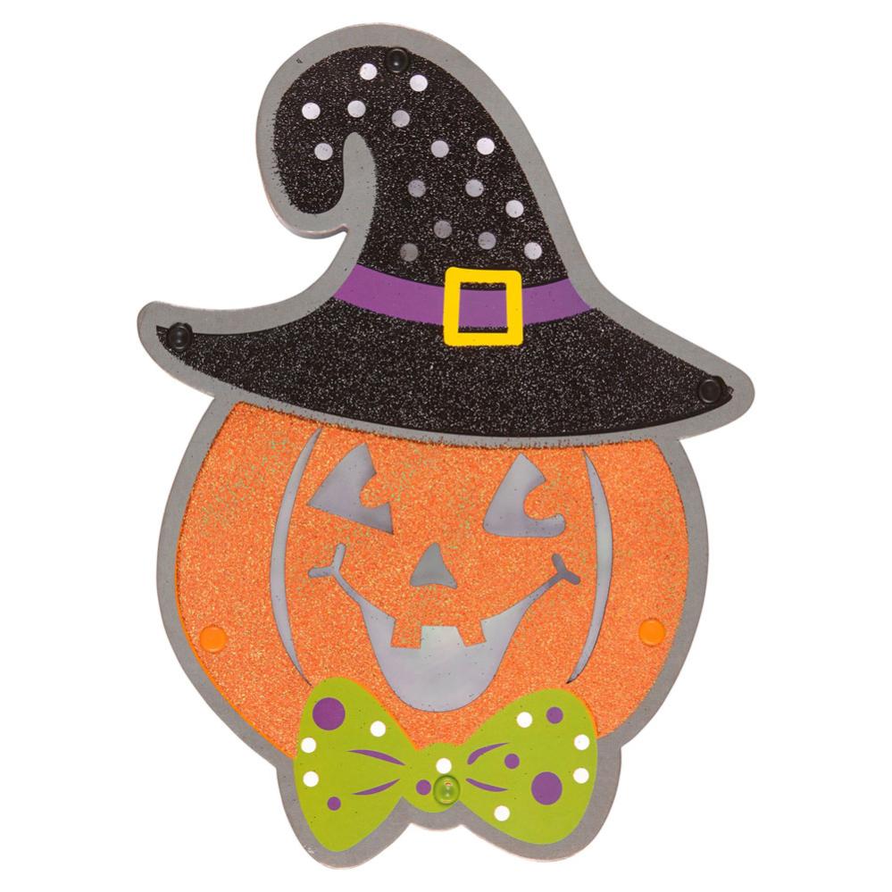 Græskar med Flerfarvet LED-Belysning omfatter en halloween dekoration i form af en glad halloween græskar med butterfly og heksehat. Græskarret er lavet af pap og har blinkende LED-belysning i flere forskellige farver. Det drives af 2 stk. AA-batterier og er ca. 26 x 19 cm stort.