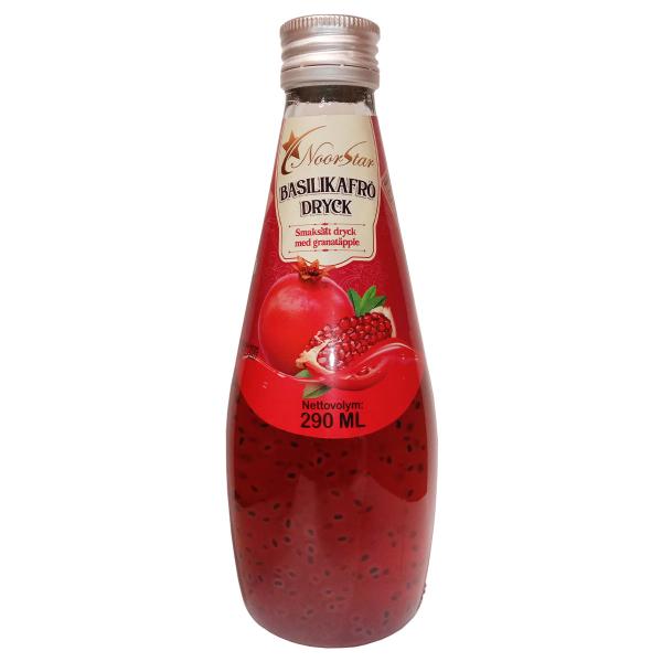 Granatæbledrik med Basilikumfrø 290 ml er en granatæbledrik, som indeholder basilikumfrø i en 290 ml glasflaske med skruelåg.
