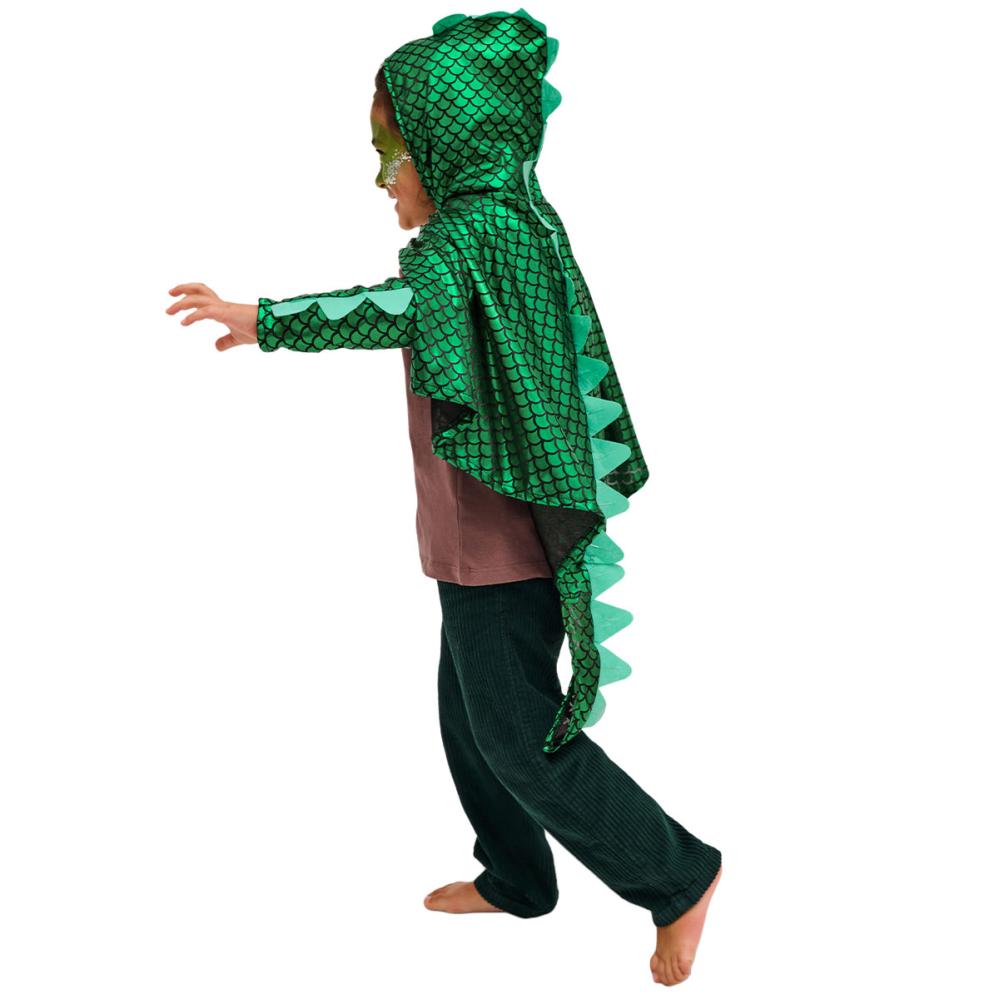 Forvandl legen til et eventyr med denne dragekappe i skimrende grøn. Med takket ryg, hale og en kappe med hætte bliver den perfekt som drageudklædning til ethvert barn. En ultimativ drageudklædning, som børn kan lide!