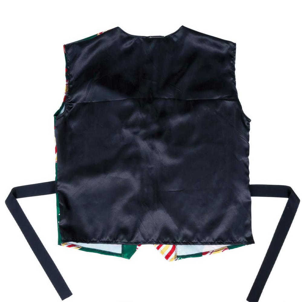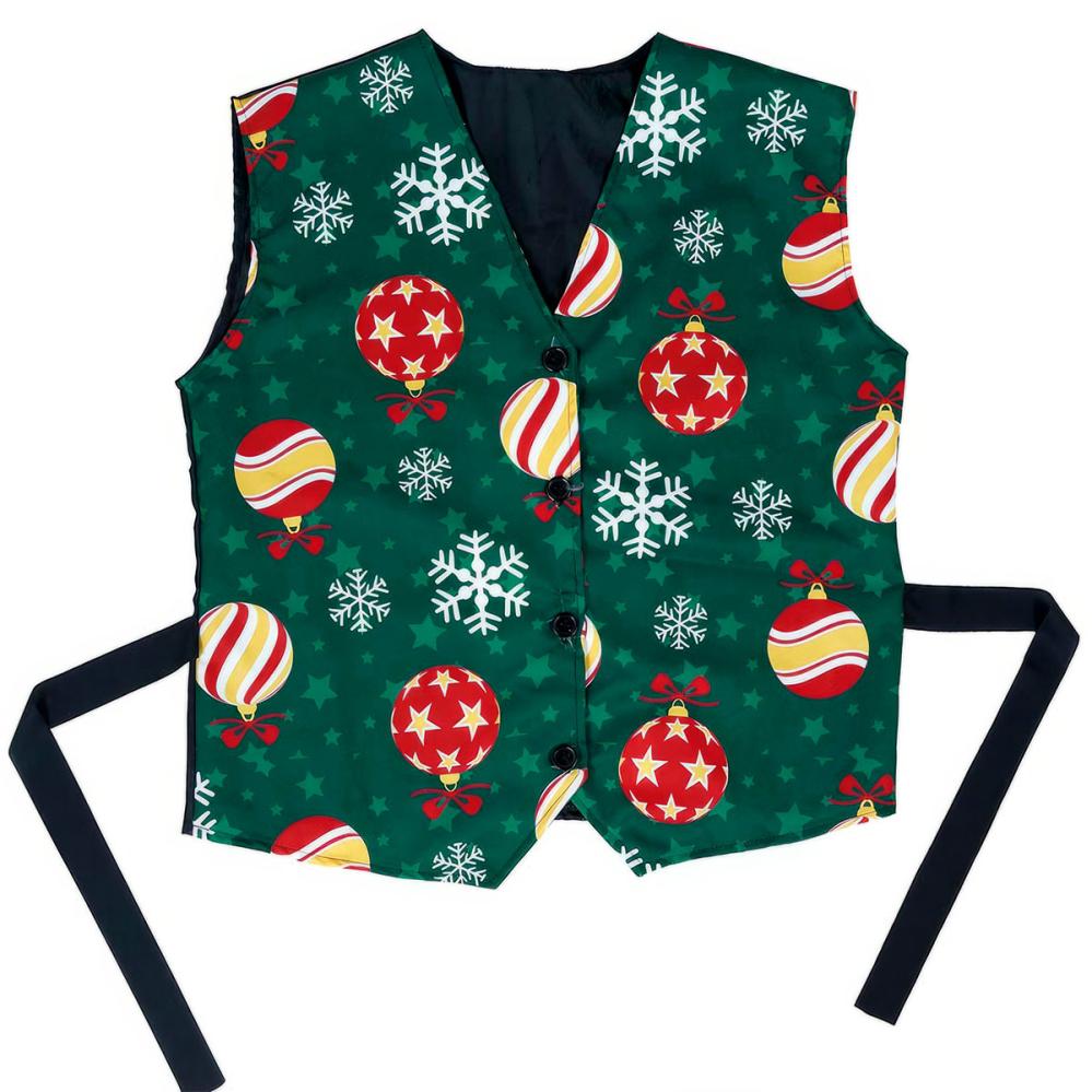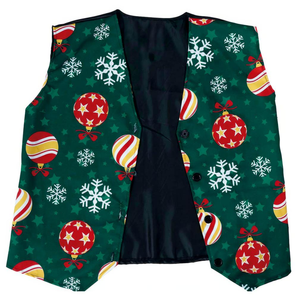 Grøn Julevest er en mørkegrøn vest med julemotiv, sorte knapper foran og et justerbart sort rygbånd for bedre pasform. Vesten prydes med motiver af stjerner, julekugler og snefnug. Bemærk at kun vesten medfølger, butterfly medfølger ikke.