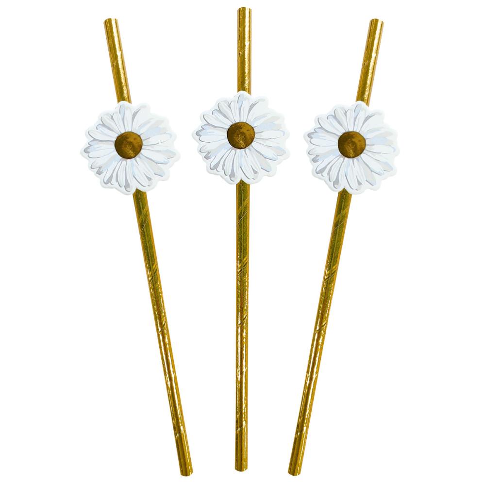 Gyldne Papsugerør Margueritter 10-pak består af ti engangssugerør med guldfolie. Hvert sugerør er dekoreret med to margueritter.