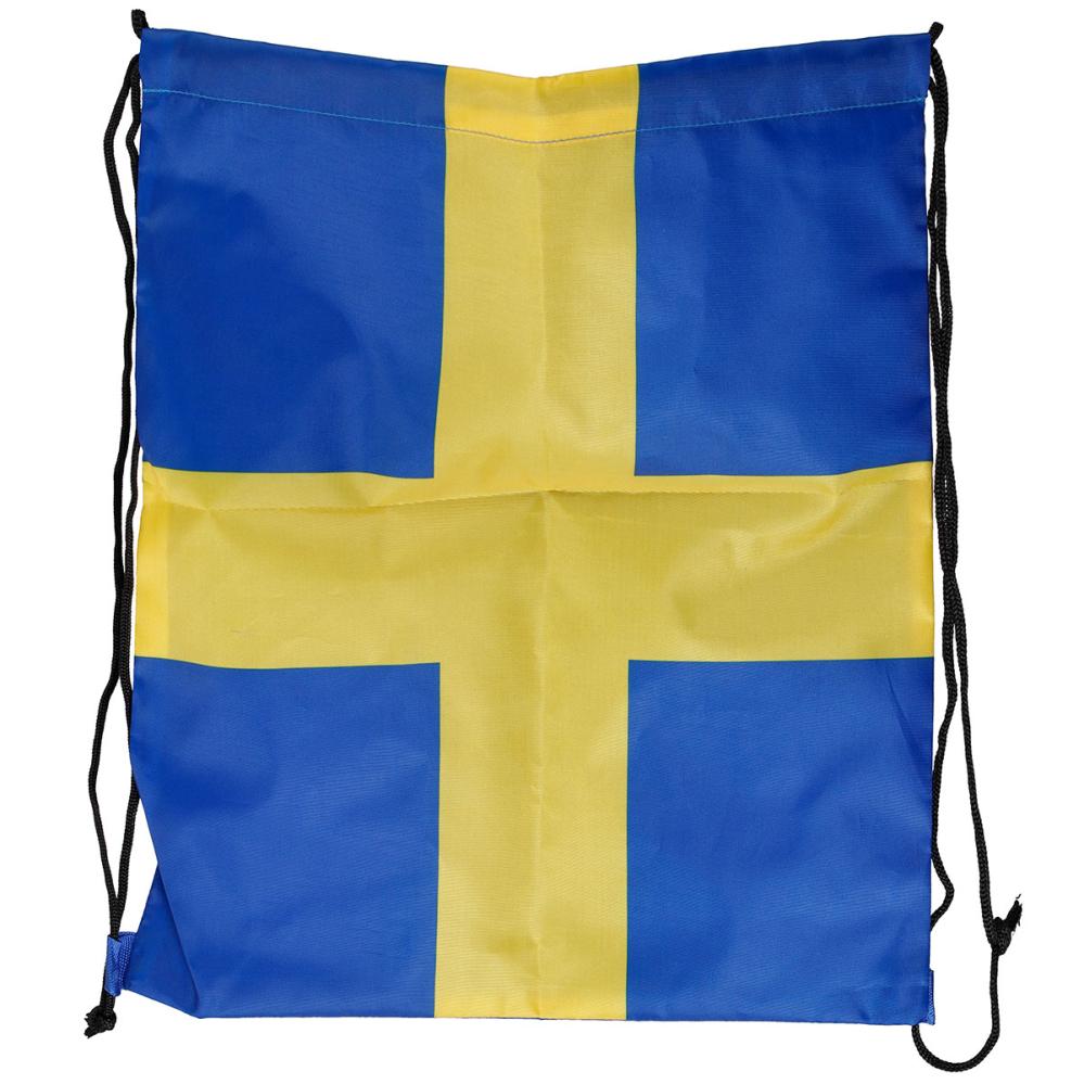 Gymnastikpose Sverige 39 x 33 cm omfatter en blå og gul gymnastikpose med motiv af det svenske flag. De to blå skuldersnore fungerer både som bærestropper og til nem åbning og lukning.