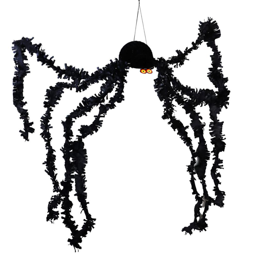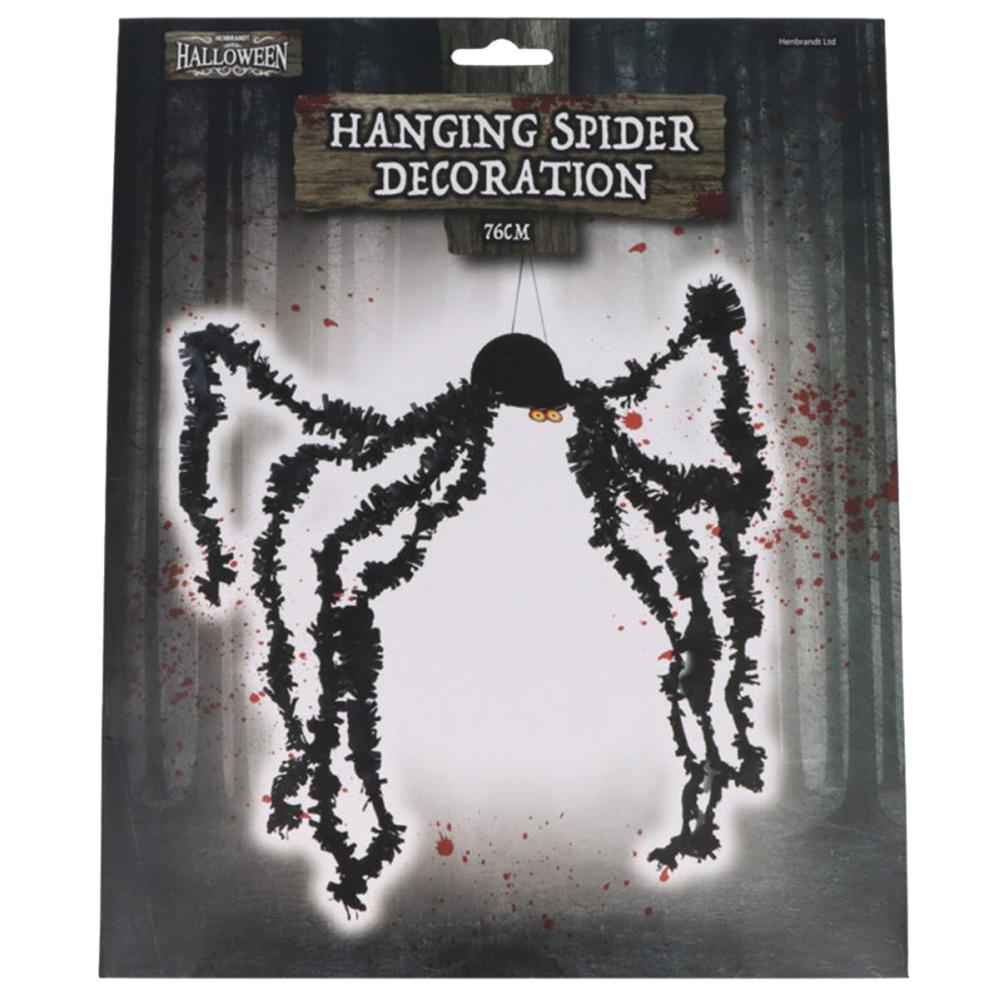 Hængende Edderkop Dekoration er en halloweendekoration i form af en sort edderkop. Selve edderkoppen kommer i form af en honeycomb med målene 11x21 cm og den har ben som måler 76 cm. Dekorationen hænges nemt op ved hjælp af den fastgjorte sorte snor, og fire papirclips medfølger for at holde honeycomben samlet.