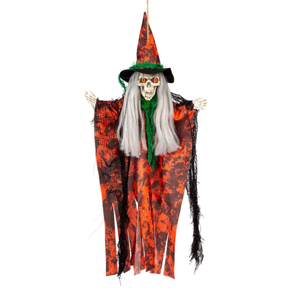 Hængende Heks 60 cm omfatter en hængende dekoration med en heks i skeletform som har lysegråt hår og er klædt i en orange og sort dragt og matchende heksehat.