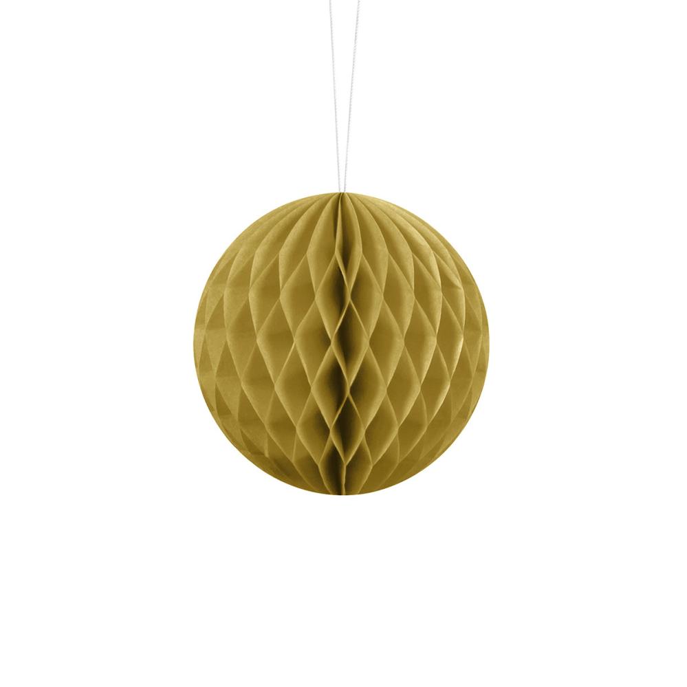 Hængende Honeycomb Guld 10 cm omfatter en kugleformet honeycomb i guldfarve med klemmer for nem montering og en hvid snor til ophængning.