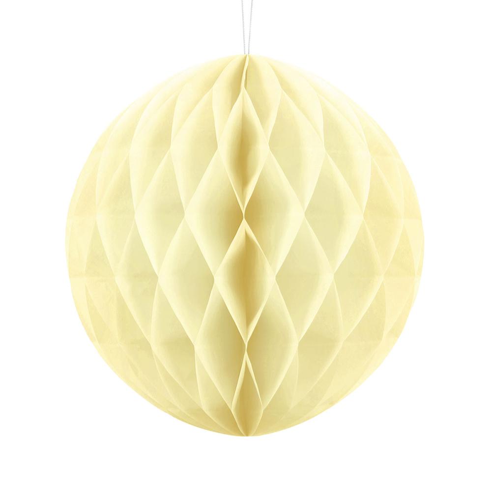 Hængende Honeycomb Halmgul 30 cm omfatter en kugleformet honeycomb i halmgul med klemmer for nem montering og en hvid snor til ophængning.